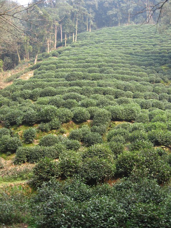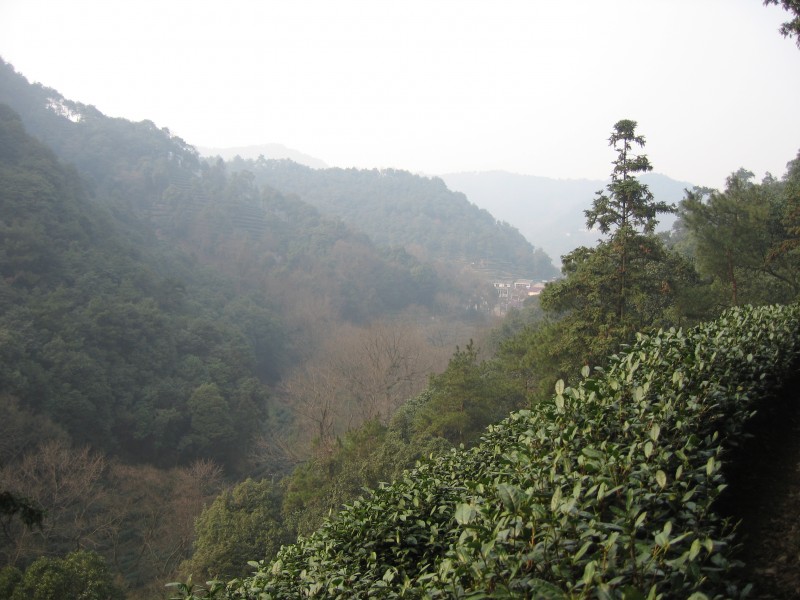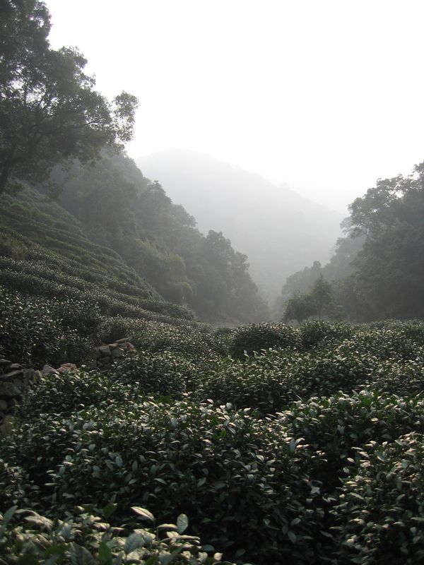 Ponieważ był to pierwszy w tym roku ciepły i pogodny weekend, Hangzhou przeżywało najazd turystów i kompletny paraliż komunikacyjny. W Longjing na szczęście było nieco lepiej, ale i tu dojazd nie był łatwy. Trochę liczyłam na zobaczenie pierwszego wiosennego zbioru, który odbywa się zwykle mniej więcej między 6 marca a przypadającym 5 kwietnia Świętem Czystej Jasności (Qingming Jie 清明節). Wiele gatunków herbaty, w tym Longjing, zbieranych w tym okresie uchodzi za najlepsze. Zbierane między 21 marca a 5 kwietnia nazywane są ming qian 明前 czyli herbatami „sprzed jasności”. Chodzi tu oczywiście o Święto Czystej Jasności, a nie porę dnia. Niestety, jeszcze kilka dni wcześniej były przymrozki i młode pędy, jeszcze prawie niewidoczne, były zbyt małe na zbiór. Podobno ma się on zacząć za około tydzień. W każdym razie spacer doliną wzdłuż strumienia, pomiędzy stromymi zboczami wzgórz porośniętymi krzewami herbaty był bardzo przyjemny. Wspięliśmy się wysoko po kamiennych stopniach, na sam szczyt herbacianego pola. A na zakończenie wycieczki oczywiście napiliśmy się herbaty i kupiliśmy jej trochę od miejscowych rolników. Była to co prawda herbata zeszłoroczna, ale ciągle świeża i przyjemna w smaku, z pięknych zielonych pędów z jednym pąkiem i jednym, najmłodszym listkiem. Parzy się ją tu niestety w szklankach, zamiast w porcelanowych naczyniach. Dzięki temu można co prawda podziwiać listki w trakcie parzenia, ale w dobrej porcelanowej czarce z przykrywką, czyli w gaiwanie, wyglądałaby pewnie piękniej i smakowała lepiej. Cóż, pewnie wielu herbaciarzy zaprotestuje, ale dla mnie wulongi i tak są najlepsze:)