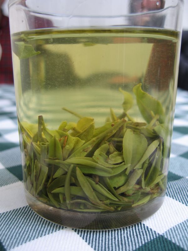 Ponieważ był to pierwszy w tym roku ciepły i pogodny weekend, Hangzhou przeżywało najazd turystów i kompletny paraliż komunikacyjny. W Longjing na szczęście było nieco lepiej, ale i tu dojazd nie był łatwy. Trochę liczyłam na zobaczenie pierwszego wiosennego zbioru, który odbywa się zwykle mniej więcej między 6 marca a przypadającym 5 kwietnia Świętem Czystej Jasności (Qingming Jie 清明節). Wiele gatunków herbaty, w tym Longjing, zbieranych w tym okresie uchodzi za najlepsze. Zbierane między 21 marca a 5 kwietnia nazywane są ming qian 明前 czyli herbatami „sprzed jasności”. Chodzi tu oczywiście o Święto Czystej Jasności, a nie porę dnia. Niestety, jeszcze kilka dni wcześniej były przymrozki i młode pędy, jeszcze prawie niewidoczne, były zbyt małe na zbiór. Podobno ma się on zacząć za około tydzień. W każdym razie spacer doliną wzdłuż strumienia, pomiędzy stromymi zboczami wzgórz porośniętymi krzewami herbaty był bardzo przyjemny. Wspięliśmy się wysoko po kamiennych stopniach, na sam szczyt herbacianego pola. A na zakończenie wycieczki oczywiście napiliśmy się herbaty i kupiliśmy jej trochę od miejscowych rolników. Była to co prawda herbata zeszłoroczna, ale ciągle świeża i przyjemna w smaku, z pięknych zielonych pędów z jednym pąkiem i jednym, najmłodszym listkiem. Parzy się ją tu niestety w szklankach, zamiast w porcelanowych naczyniach. Dzięki temu można co prawda podziwiać listki w trakcie parzenia, ale w dobrej porcelanowej czarce z przykrywką, czyli w gaiwanie, wyglądałaby pewnie piękniej i smakowała lepiej. Cóż, pewnie wielu herbaciarzy zaprotestuje, ale dla mnie wulongi i tak są najlepsze:)