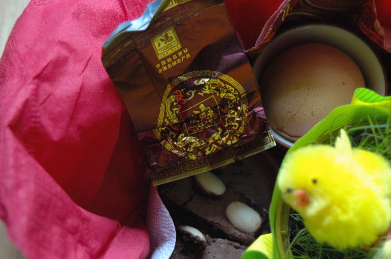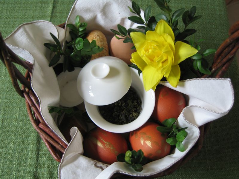 W naszych święconkach nie może zabraknąć herbaty. W tym roku święcimy turkusową Tie Guanyin z Anxi, nieco bardziej „dojrzałą” w smaku od tej, którą piłyśmy ostatnio. Ładnie prezentuje się w białym porcelanowym gaiwanie wstawionym do koszyczka. Jajka są symbolem nowego życia, sól – chroni od zepsucia, a herbata? Oczyszcza serce, oczywiście.