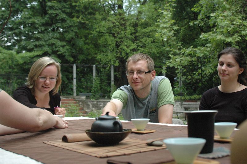 W ostatni majowy weekend powędrowałyśmy z herbatą do Ogrodów. W sobotę parzyłyśmy urodzinową herbatę Magdy w Ogrodzie Botanicznym w Powsinie, na trawie, wśród kwitnących rododendronów. Nasz nowy nabytek, czerwona herbata z Yunnanu, parzona w porcelanowym gaiwanie, smakowała miodem i… pluszowym misiem. Rzeczywiście, prawdziwy z niej Puchatek – ani jednego rozwiniętego liścia, same młode pąki pokryte gęsto złotorudym puszkiem. A w niedzielę, w gościnnym Ogrodzie Botanicznym UW przy Łazienkach – Tie Guanyin w czajniczku tym razem, podczas trzech spotkań herbacianych, każde w gronie 6 osób. Po długiej zimie tak nam (i herbacie) dobrze w ogrodach, że tego lata zamierzamy parzyć w plenerze jak najczęściej.
