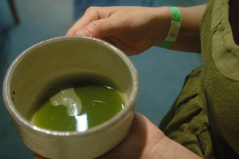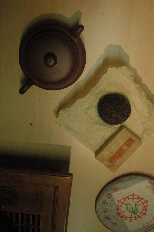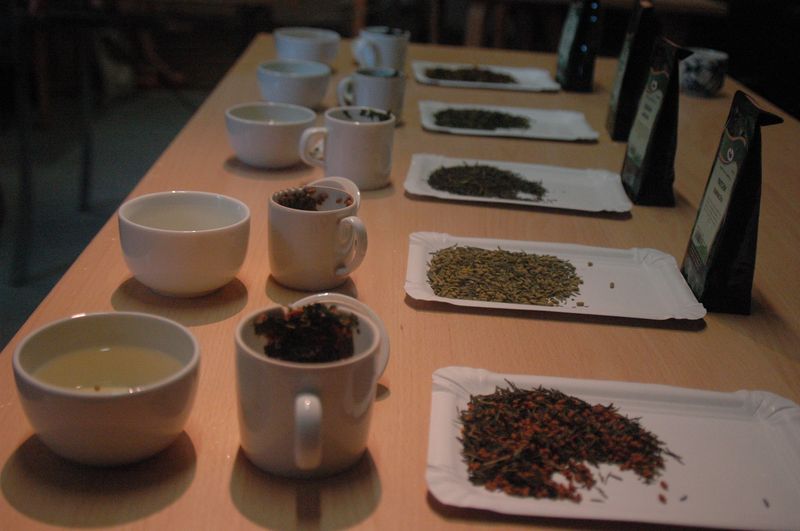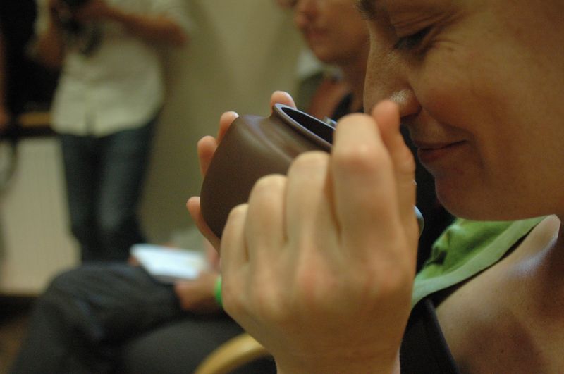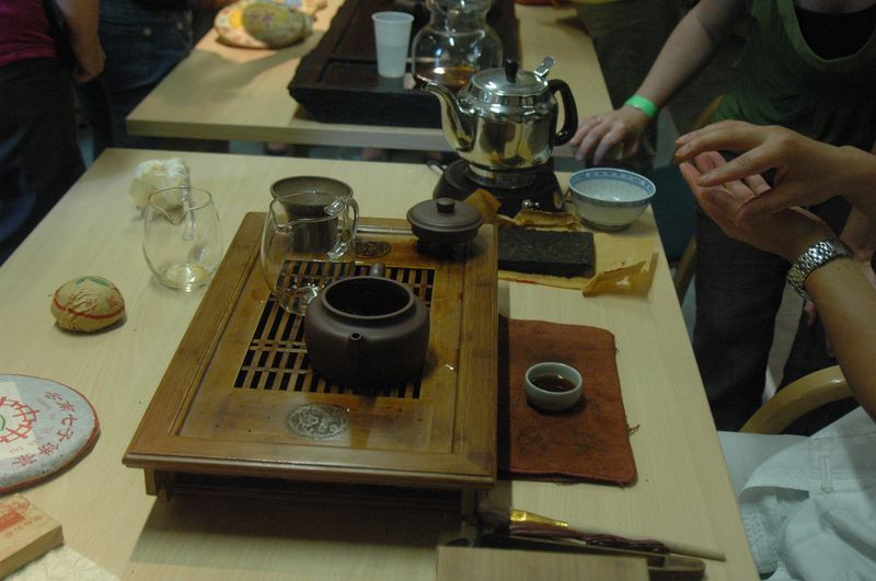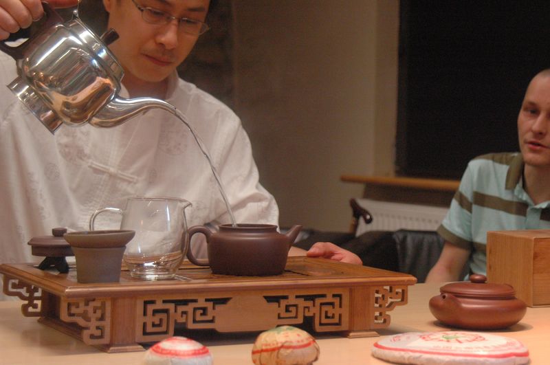 Rano postawiła nas na nogi zimna Żelazna Bogini Miłosierdzia. A potem przyszła kolej na herbaty japońskie – Gyokuro, Sencha, Bancha, Shincha, Matcha, Tencha, Kabusecha, Kukicha, Hojicha , Tamaryokucha… ciąg dalszy oglądania, wąchania i kosztowania naparów.  I po obiedzie pu’ery, na które czekałyśmy najbardziej. Na same herbaty, opowieści o nich i na naszych znajomych-nie-znajomych z Praskiego tea-netu.  Wynalezieni przez naszą Justynę podczas pobytu w Pradze, a przez nas poznani dotychczas mailowo. Tu mieliśmy uścisnąć sobie dłoń i spotkać się przy herbacie dnia następnego w Pradze. Tak też się stało, ale o tym w następnej opowieści.  W tej mamy jeszcze konferencję o pu’erach i pokaz gongfu cha naszych czesko-chińskich przyjaciół (w wersji „świeżej” ,po czesku”zielonej” i „dojrzałej” , po czesku „ciemnej”). Pokaz wiedzy i umiejętności, o których już Ania wcześniej pisała. Po wszystkim zapowiedziałyśmy się dnia następnego i dostałyśmy zaproszenie z noclegiem (jeden z herbaciarzy udostępnił nam swój pokój) i ruszyłyśmy do swoich zajęć – Ania na spotkania herbaciane na zamkowym tarasie wśród bonsai, ja na kiermasz herbaciany w baszcie wśród ceramiki. Chętnych do kupowania było niewielu, ale trochę poczęstowałyśmy i potem częstowałyśmy dalej na dziedzińcowym straganie. Pożegnalne czarki.