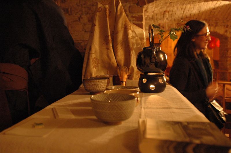 Święto herbaty otwarte! Wczoraj o 19.00 rozpoczęliśmy świętowanie początku (naszego) i środka (chińskiego) jesieni. Na początek była czarka pysznej lekkiej matchy z ciasteczkiem – marcepanowym liściem miłorzębu (nieco słodyczy i goryczy), opowieści o rytuale spotkań, znaczeniu zachowań, gestów, naczyń, innych akcesoriów i samej herbaty w japońskiej kulturze. W towarzystwie kilkunastu osób, kaligrafii przedstawiającej pełnię księżyca i skromnego przydrożnego kwiatka spędziliśmy 2 godziny w podziemiach herbaciarni na ul. Bednarskiej. I dziś tam zapraszamy o tej samej samej porze – tym razem na opowieści i smakowanie herbaty chińskiej.