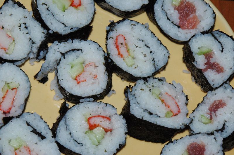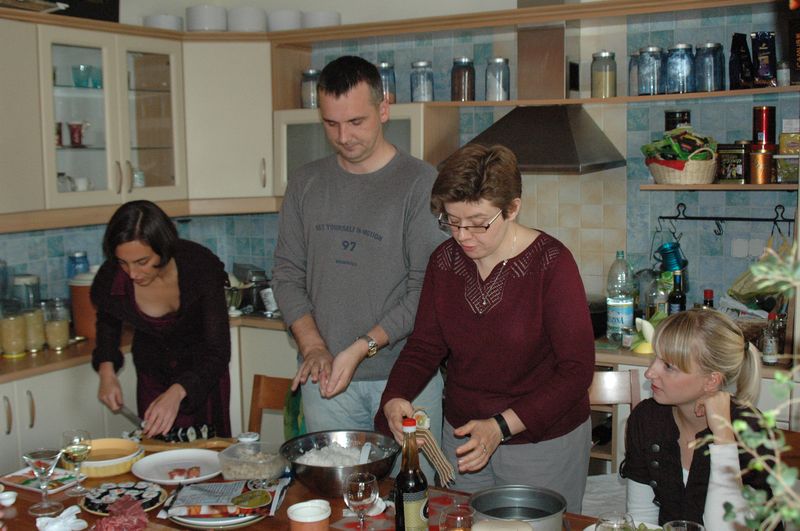 Załoga zebrała się na Żytniej, każdy w swoim czasie, ze swoim wkładem żywieniowym i osobowym. I ruszyliśmy do roboty: Marta do ryżu, Olga do ryb, Andrzej do ogórków, Zosia do imbiru, Rafał do dyni, Mariusz do wina, Ania do herbaty, a ja do szafek po wszystko, co trzeba. I ruszyliśmy: Marta mieszała, Olga dzieliła, Andrzej obierał, Zosia wyjmowała, Rafał opowiadał, Mariusz nalewał, Ania parzyła, ja kroiłam. I robiąc tak wąchaliśmy, kosztowaliśmy, piliśmy i suszyliśmy.