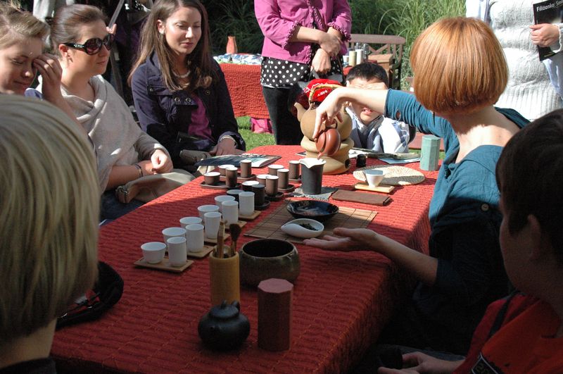 Dzień był piękny. Ciepły, słoneczny, lekko mglisty i zagęstniony. W Ogrodzie kwitły jeszcze kwiaty i żółkły już liście. Taki piękny dzień na pożegnanie lata i przywitanie jesieni. Oprócz kwiatów i liści na stoiskach mieniły się kolorowe kubki, miski, talerze, czajniki. Pachniało jesienią, ziemią i herbatą. Tak było rano, zanim wszystko się zaczęło. A potem wpłynął pierwszy strumień ludzi i falami kolejne. Oglądali naczynia, wąchali herbaty, próbowali, pytali, wybierali. Wszystko szczelnie się wypełniło intensywnym ruchem i dźwiękiem. I przez kilka godzin trwało to wspólne brzęczenie, to pochylanie się nad ceramicznymi kielichami i wypijanie herbacianych nektarów. Jak to w Ogrodzie. Poszczególne stoiska skupiały większe grupy, które przemieszczały się oddzielnie i wspólnie. Przystawały na dłużej, gdy działo się coś więcej, gdy można było więcej zobaczyć, usłyszeć, dowiedzieć się – o mieszaniu herbat, o herbatach artystycznych, rozgrzewających na jesień i najlepszych chińskich i tajwańskich (różnych kolorów: zielonych, białych , żółtych, turkusowych, czerwonych i czarnych). Zbierali ten „nektar” i ruszali dalej.